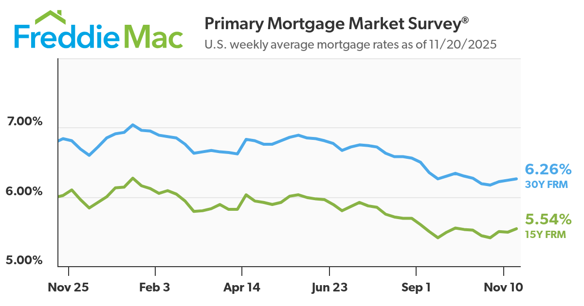 • The 30-year FRM averaged 6.26% as of November 20, 2025, up from last week when it averaged 6.24%. A year ago at this time, the 30-year FRM averaged 6.84%.
