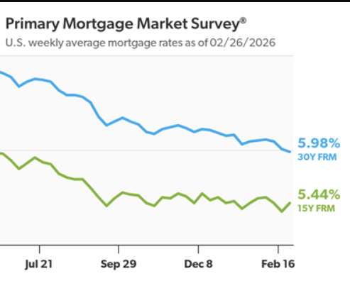 - The 30-year FRM averaged 5.98% as of February 26, 2026, down from last week when it averaged 6.01%. A year ago at this time, the 30-year FRM averaged 6.76%.