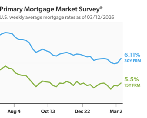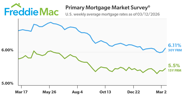 • The 30-year FRM averaged 6.11% as of March 12, 2026, up from last week when it averaged 6.00%. A year ago at this time, the 30-year FRM averaged 6.65%.