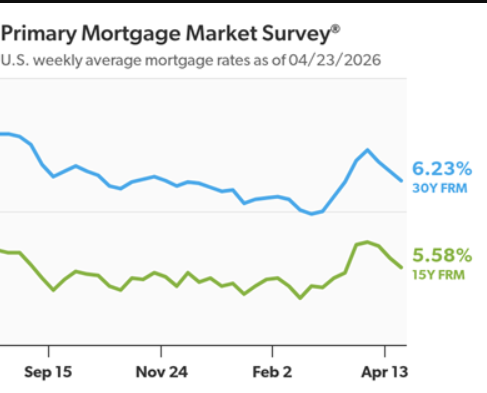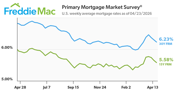 • The 30-year FRM averaged 6.23% as of April 23, 2026, down from last week when it averaged 6.30%. A year ago at this time, the 30-year FRM averaged 6.81%.